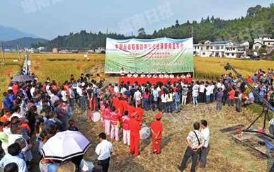 10月10日下午,中國超級稻第四期研究進展新聞發布會在溆浦縣橫板橋鄉紅星村超級稻基地舉行,經專家組現場測產驗收,百畝片畝產創造了1026.7公斤的新紀錄。 記者 李健 攝