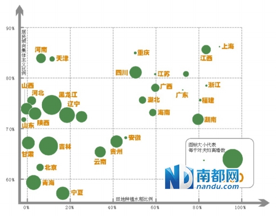 以前的研究顯示,個人主義的國家離婚率更高。因此,研究者搜集了中國1996年、2000年和2010年的離婚率數據,結果顯示種植水稻地區的離婚率比種植小麥地區的離婚率更低,“水稻文化注重避免沖突、保持關系,這可能讓人們不太愿意離婚。”